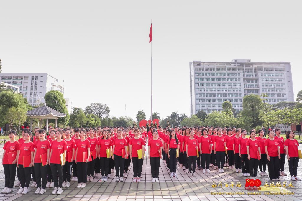 参加活动的师生手执党旗、国旗,身上贴着五星爱心贴纸,口罩上印着“永远跟党走”的图案,党员佩戴党徽,现场气氛在一片红色的海洋中更显热烈、喜庆而庄严。