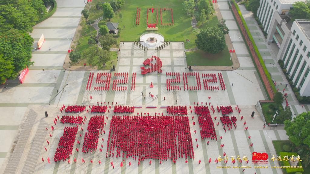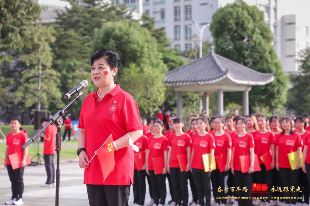 7月1日清晨,校园里红旗招展、歌声激昂,2600名师生井然有序地在学校国旗广场上,举行“永远跟党走”升旗仪式暨师生歌咏活动,以饱满的爱党爱国热情庆祝中国共产党成立100周年。
