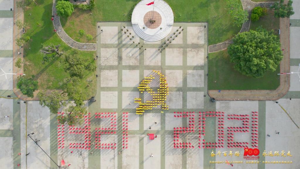在她的带领下,在场师生再次把歌声献给党,《保卫黄河》《团结就是力量》《没有共产党就没有新中国》……一首又一首的经典歌曲饱含着百年的红色记忆,嘹亮的歌声令所有人都沉浸其中。在歌声中,由学生组成的字操方阵随着音乐变换出“100”“1921”“2021”和党徽等图形,热烈庆祝中国共产党成立100周年!